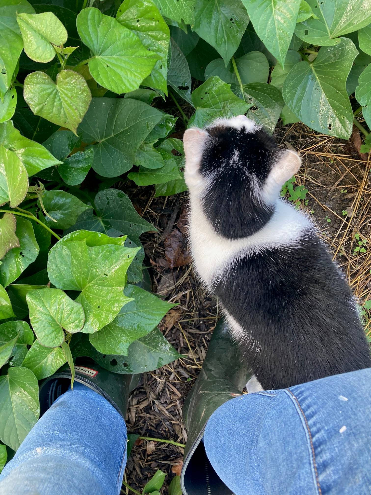 We'll harvest them around the time of the first frost, whether or not they get to the point of starting to wilt and die back. But in the meantime, look at all of those sweet potato greens!